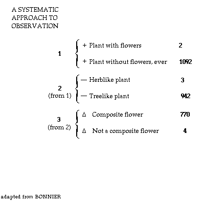 Un point qui peut sembler trivial est la qualité "dichotomique" des questions Lamarckiennes. Chaque paire de questions formule des observations mutuellement exclusives (en principe seulement!). Il suffit de répondre "Oui" à l'une des deux questions pour atteindre la paire de questions suivante. Il pourrait sembler plus simple de ne formuler qu'une seule question et de suivre l'une des deux branches "oui" ou "non". Plus simple pour qui? Les avantages qu'on a à se situer toujours sur une branche "oui" sont, à vrai dire, inestimables. On peut ainsi, en changeant peu la syntaxe et la ponctuation, convertir le parcours dans les questions en suite d'affirmations parfaitement cohérentes. La série d'affirmations se construit assez mécaniquement, et sans qu'il soit besoin d'y appliquer la moindre logique. Le travail d'ingénieurie linguistique que cela représente de la part de Lamarck est d'une élégance certaine.