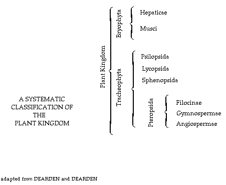 Quant à Linné, son approche de l'espèce est la suivante: Il compare les espèces entre-elles, cherchant à les grouper en catégories d'espèces semblables pour tel ou tel autre critère. En procédant ainsi, il découvre un nombre relativement faible de traits communs à de très nombreuses espèces. A l'intérieur de chaque groupement, il distingue encore des sous-groupes, etc. Des caractéristiques les plus larges aux plus étroites, une version moderne du système de Linné comprend: le règne, l'embranchement, la classe, la famille, le genre, l'espèce. Pour appartenir au règne végétal, il suffit en principe d'être vert et d'avoir un tissu de forme précise. Pour appartenir ensuite à l'embranchement des bryophytes, par exemple, il suffit de n'avoir aucun système vasculaire.