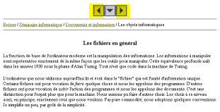 | Cas particulier : une liste peut représenter une série de documents qu'on peut lire dans l'ordre. [ Il peut s'agir par exemple du découpage d'un texte long ou d'une longue série d'images. Le découpage évite le chargement de tout l'ensemble pour éviter l'attente ] Chaque document de la série ciblée par la liste affiche des boutons pour aller au "suivant" et au "précédent" (surlignés en jaune dans la figure ci-contre). Ceci évite au lecteur la distraction de revenir chaque fois au répertoire. Le document ci-contre n'est pas un répertoire mais les liens associés aux flèches représentent un "petit bout de répertoire embarqué", c'est à dire, un voisinage. |